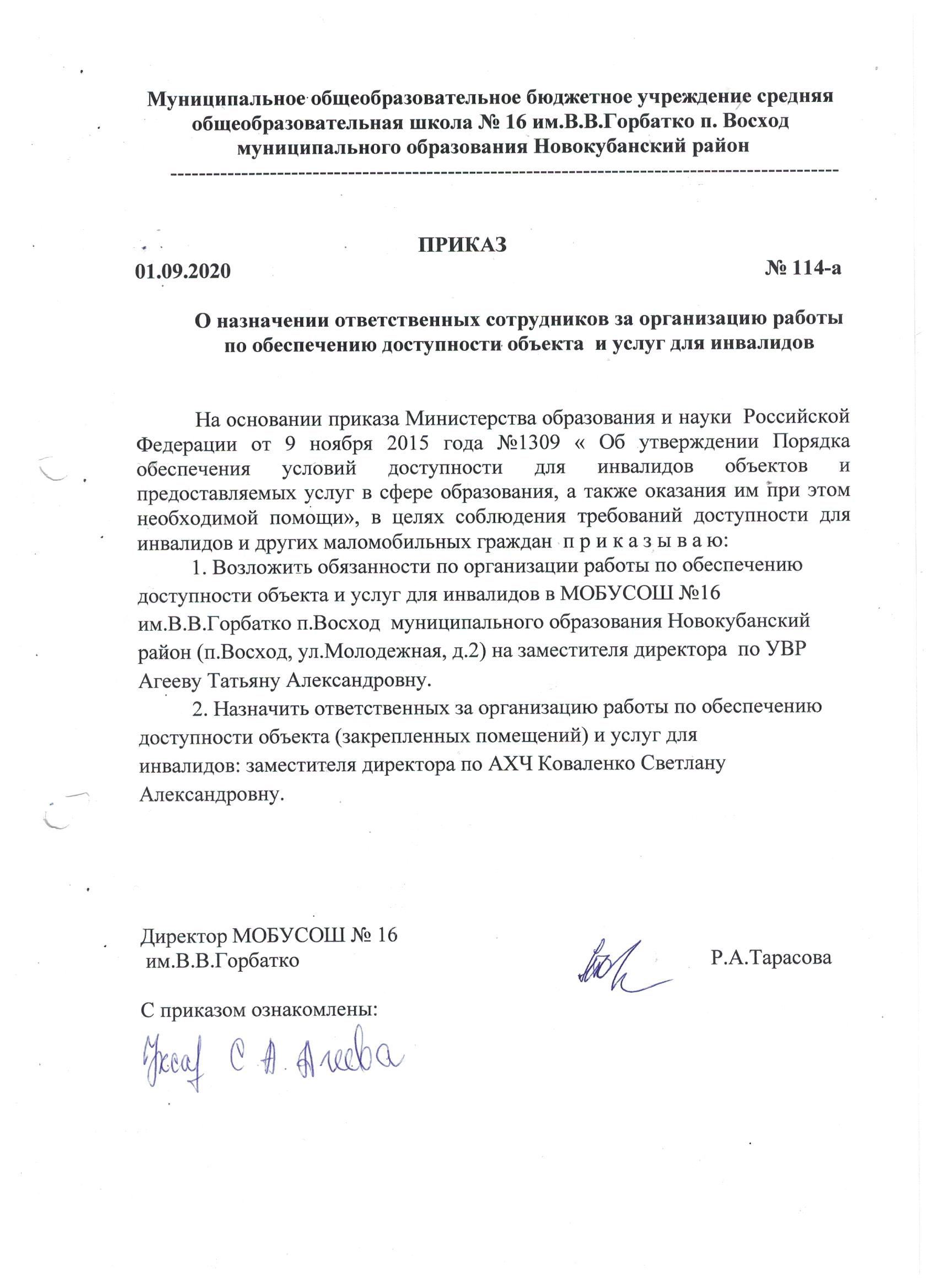 О назначении ответственных сотрудников за организацию работы по обеспечению доступности объекта и услуг для инвалидов в МОБУСОШ №16 им.В.В.Горбатко