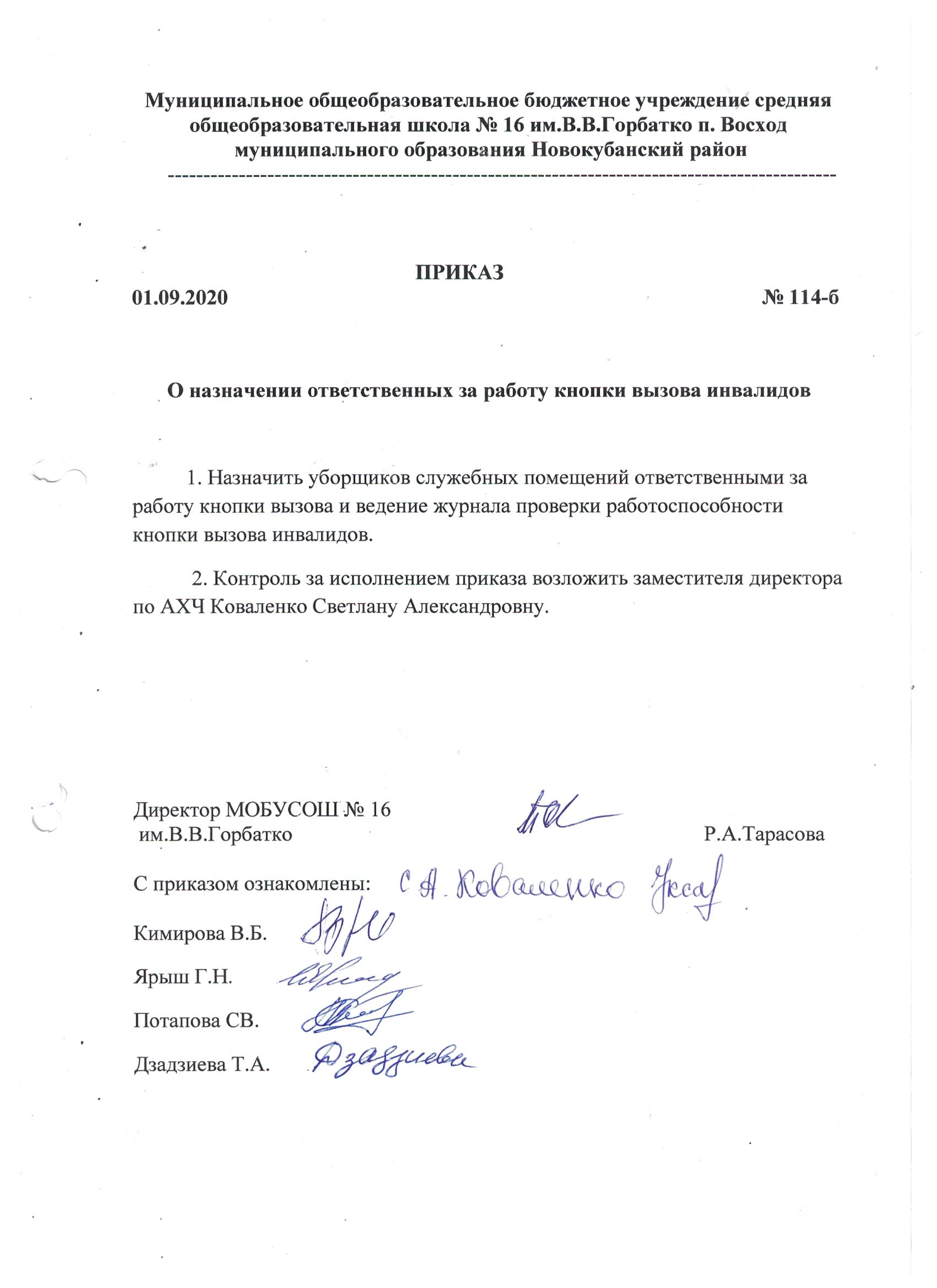 О назначении ответственного лица за работу кнопки вызова для инвалидов и других категорий маломобильных граждан в МОБУСОШ №16 им.В.В.Горбатко